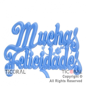 Adorno para torta con forma de frase "Muchas felicidades". Material: plástico. Color: celeste. Medida: 9,5 cm. x 5 cm. Pack de 36 unidades. Se utiliza como decoración para tortas de cumpleaños o de cualquier otro festejo (bodas, aniversarios, fiesta de egresados, etc.).