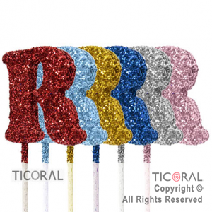 Adorno de telgopor. Es un pinche con la letra R, decorada con gibre. Pack de 6 unidades. Ideal para decoración de tortas, centros de mesa o mesas de souvenirs en cumpleaños infantiles. - telgopor - - letras con gibre