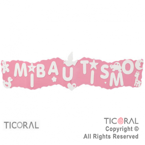 Guirnalda para Bautismo. Tiene apliques de letras blancas que forman la frase: "Mi Bautismo". Color: rosa. Material: goma eva. Medida: 1,10 metros. Ideal para decoración de fiestas de Bautismo.