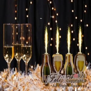 Es un set de bengalas "Feliz Año". Contiene: un cartel con el diseño de Feliz año y el motivo de 2 copas y 2 botellas, con 4 bengalas oro, gibreados en color oro. Ideal para utilizar como decoración en la mesa de fin de año o año nuevo. También se puede utilizar para decorar tortas, muffins, cupcakes, tortas falsas, budines, cumpleaños, aniversarios. Ideal para el momento del brindis.
