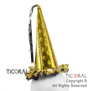 Bonete metalizado, de color dorado. Tiene un diseño holográfico con un reborde fruncido alrededor. En la parte de arriba, tiene tiras de colores de papel metalizado. Medida: 48 cm. Se utiliza para cumpleaños infantiles o para el carnaval carioca o en tandas temáticas de colores metalizados, holográficas o de color dorado.