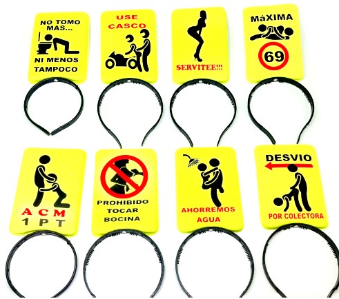 Vinchas con frases. Pack de seis. Vienen diferentes frases en el mismo paquete. No se pueden seleccionar las frases. Se utilizan en el carnaval carioca, en tandas temáticas en cumpleaños o para disfraces. Contiene frases surtidas, no se puede selccionar la frase.