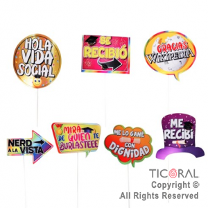Photo props, foto props, son carteles y frases para sostener el la mano mientras que se saca la foto. Props divertidos. Contenido: 7 unidades. Contiene 7 frases y o carteles que son los siguientes: 1 con leyenda "me lo gane con dignidad", 1 flecha con leyenda "nerd a la vista", 1 con leyenda "hola vida social", 1 con leyenda "gracias wikipedia", 1 sombrero con la leyenda "me recibi", 1 con la leyenda "mira de quien te burlaste" y 1 con la leyenda " se recibió".