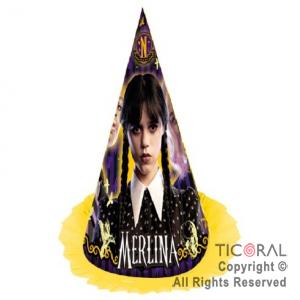 Bonete con diseño de "Merlina". Alrededor del sombrero, tiene un decorado de papel maché. Material: cartón. Medidas: 28 cm.. Son para cumpleaños (se reparten en cualquier momento de la fiesta o como souvenir). Pueden combinarse con otros productos de la línea de "Merlina".