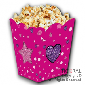 Cajita pochoclera de la línea "Girls". Contiene 6 unidades. Recipiente de carton laminado. Práctica y facil de armar. Ideal para fiestas de cumpleaños infantiles y puede combinarse con otro producto de la línea.